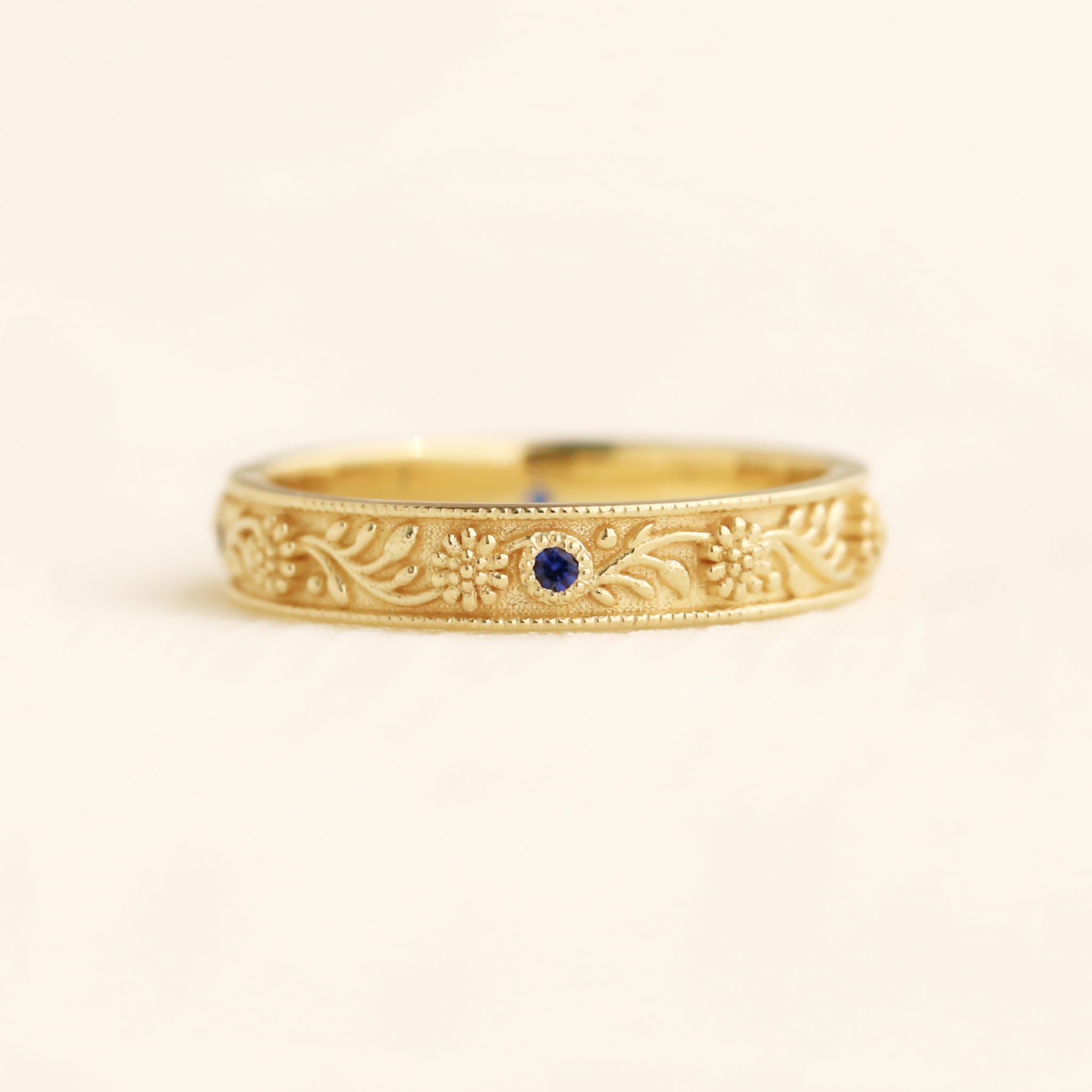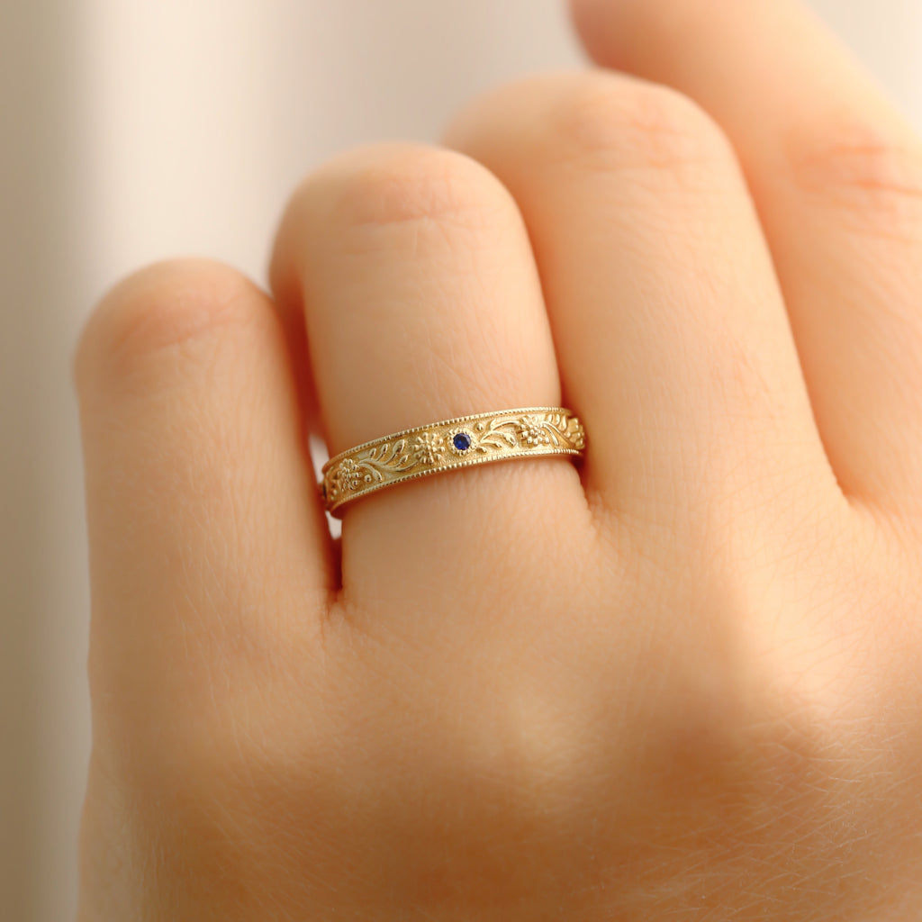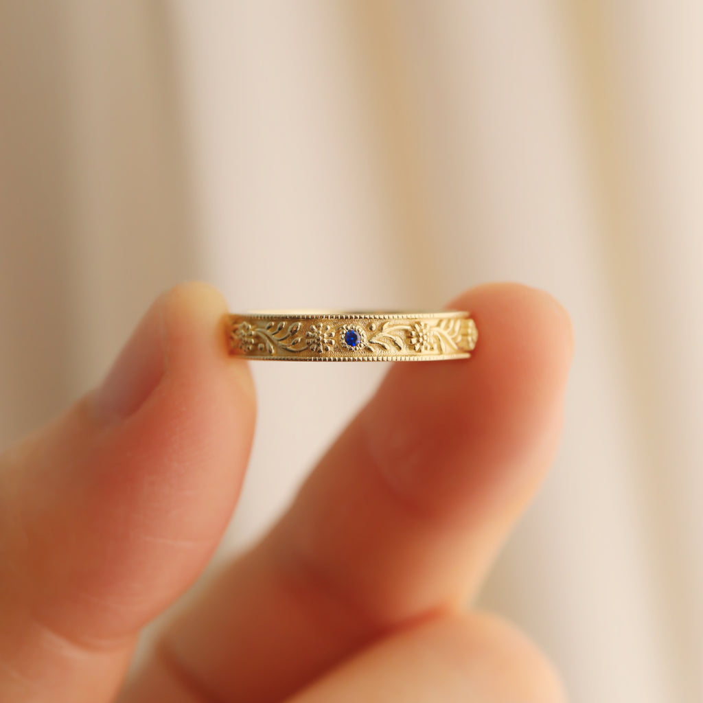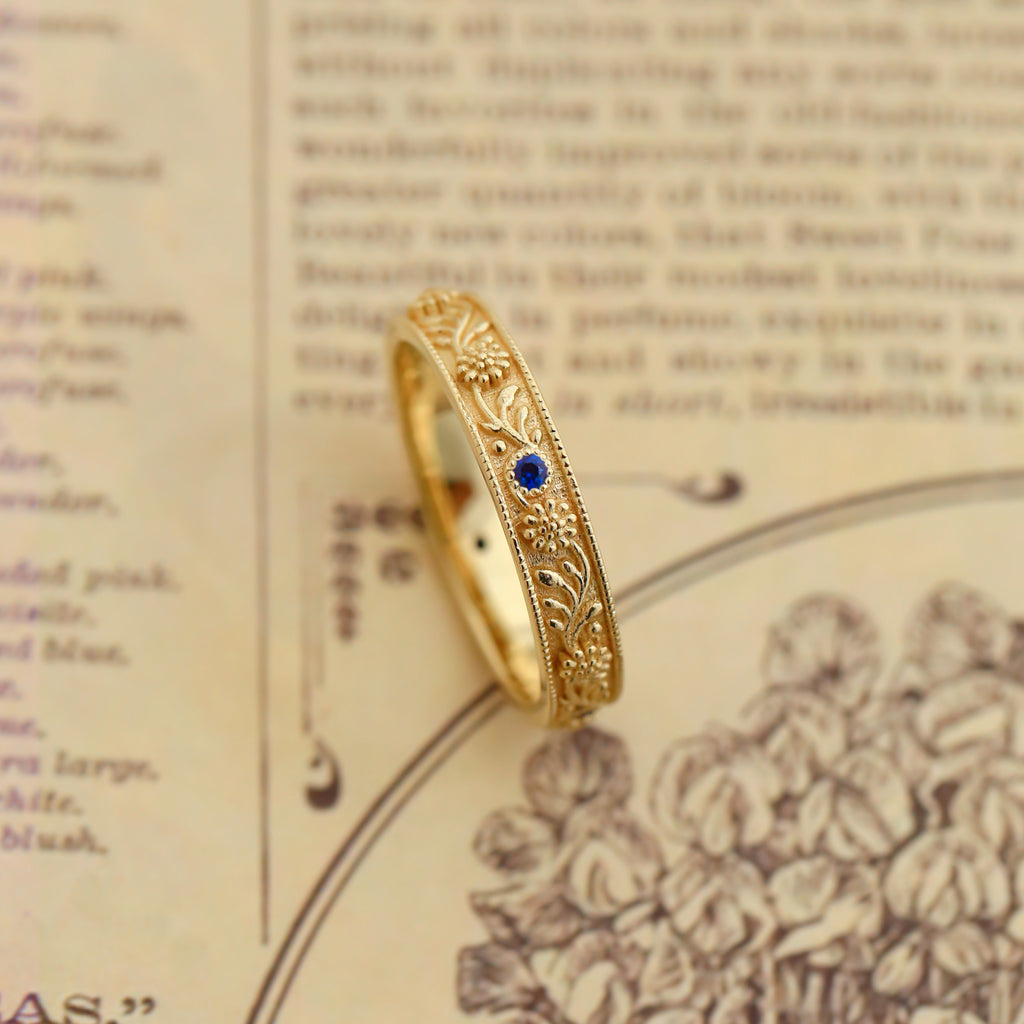 This enchanting eternity band captures the timeless beauty of September’s birthstone, Sapphire, and birth flower, the Aster. Intricately adorned with delicate floral engravings and deep sapphire accents, it is further elevated by refined French milgrain detailing, exuding an air of vintage romance.