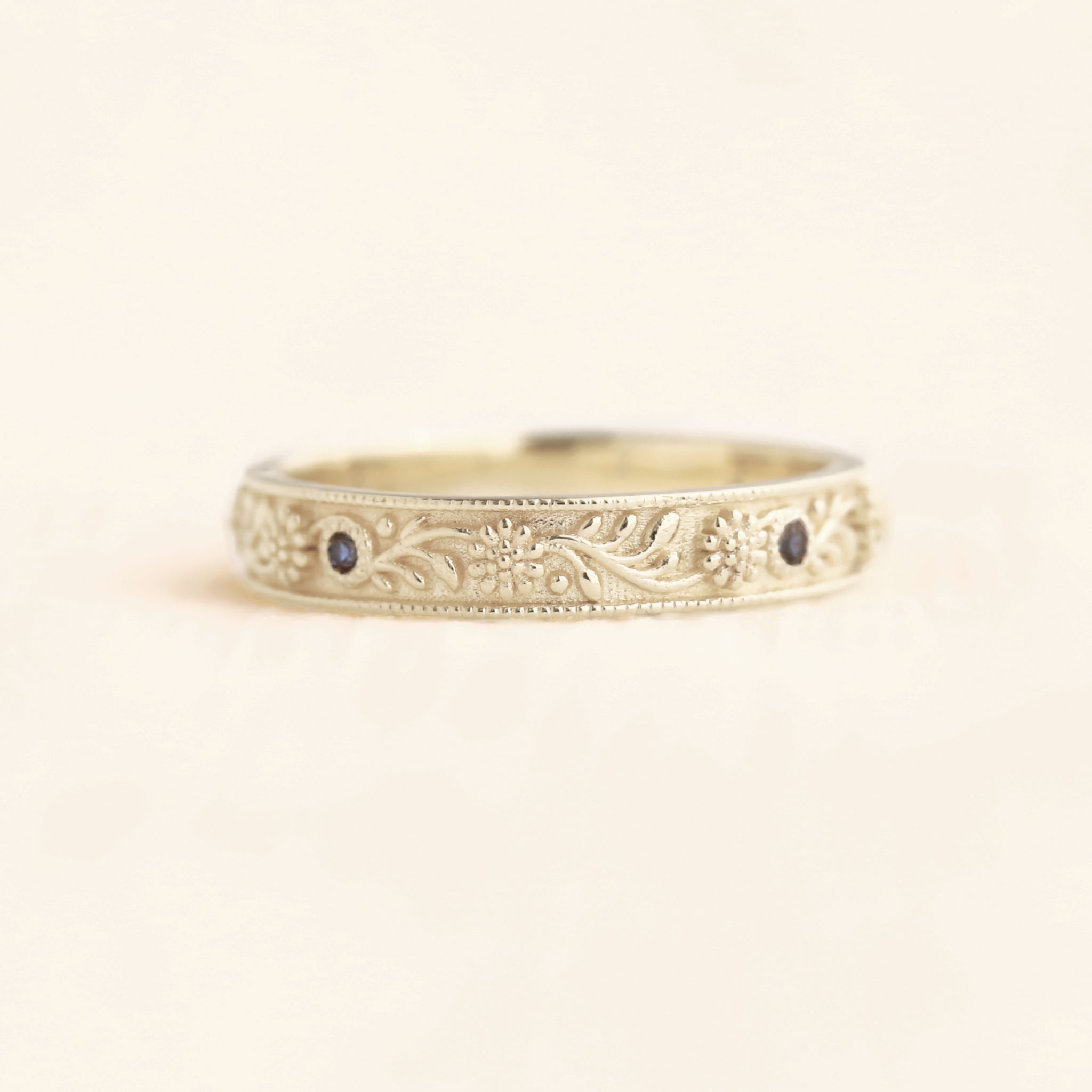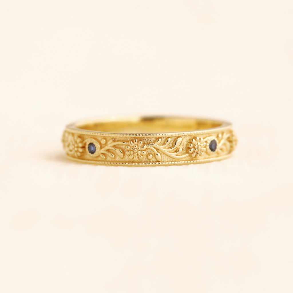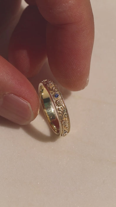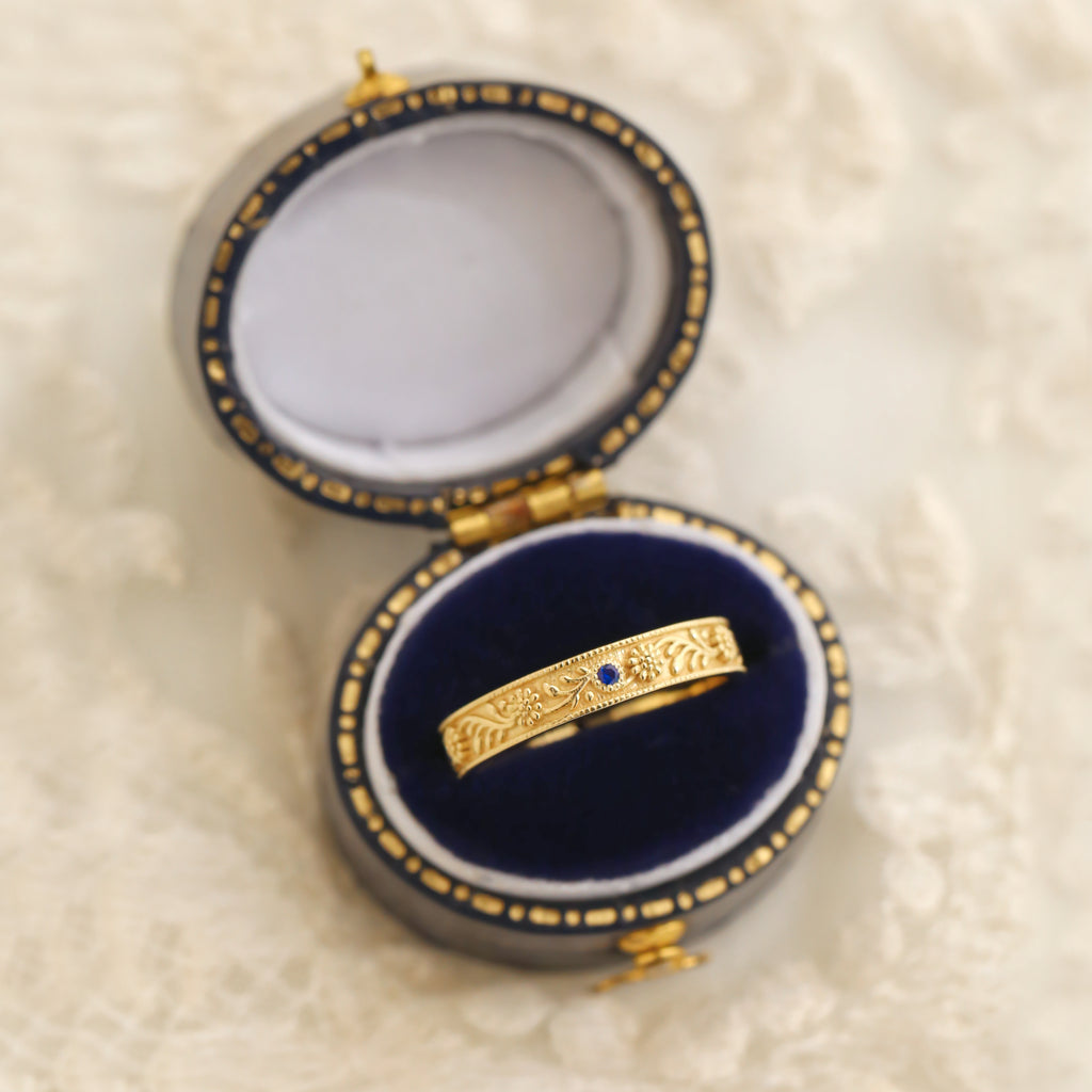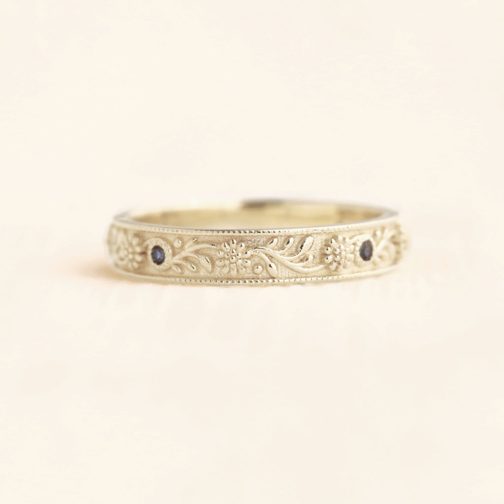 This enchanting eternity band captures the timeless beauty of September’s birthstone, Sapphire, and birth flower, the Aster. Intricately adorned with delicate floral engravings and deep sapphire accents, it is further elevated by refined French milgrain detailing, exuding an air of vintage romance.