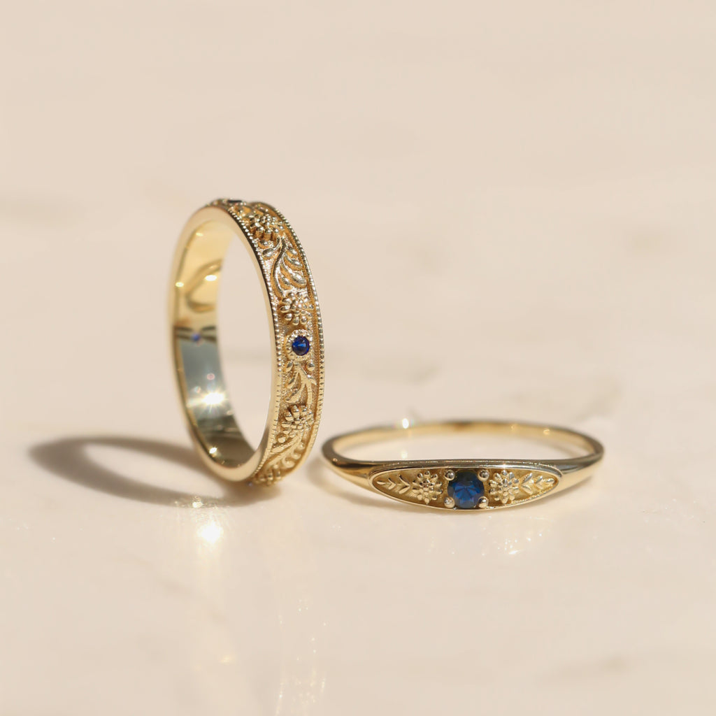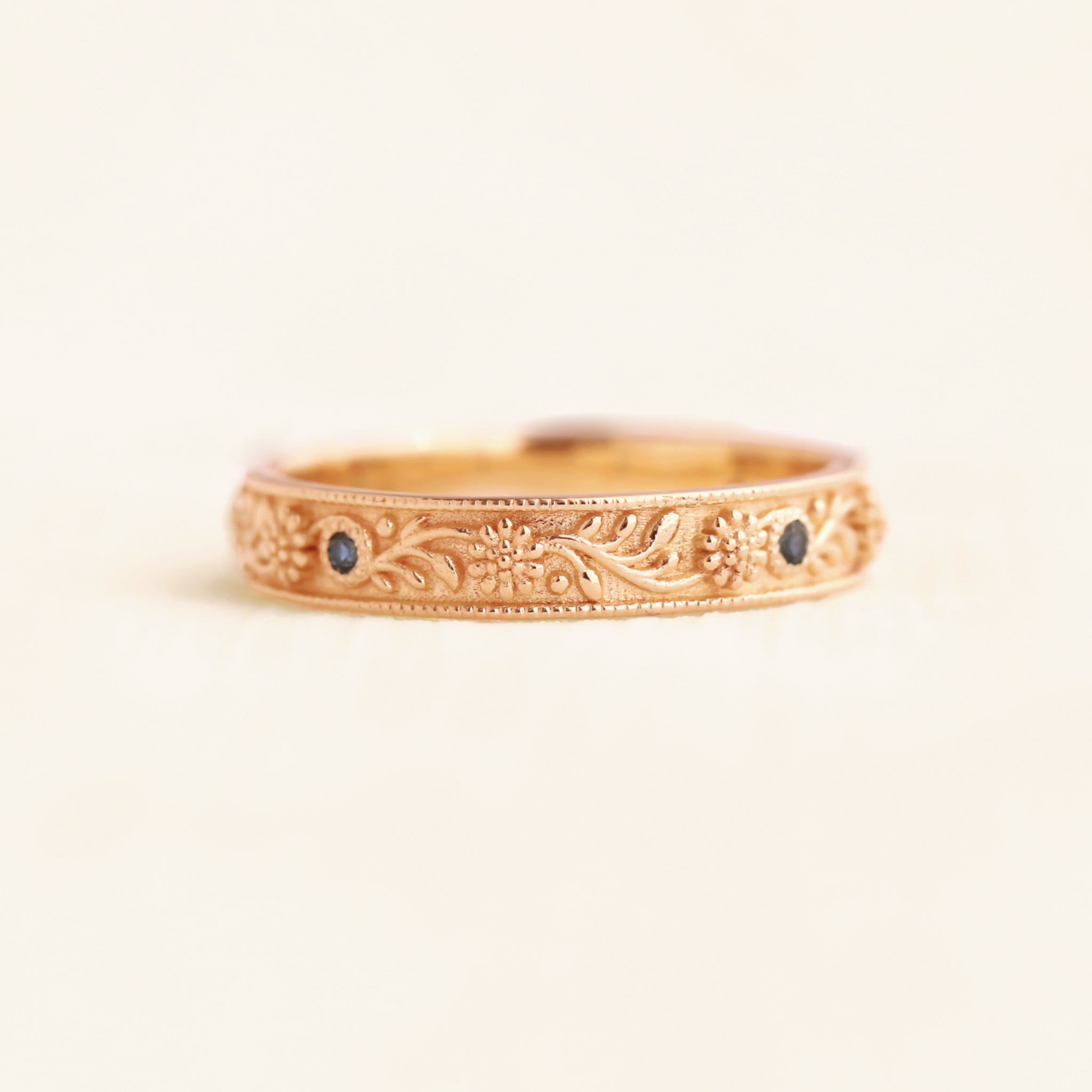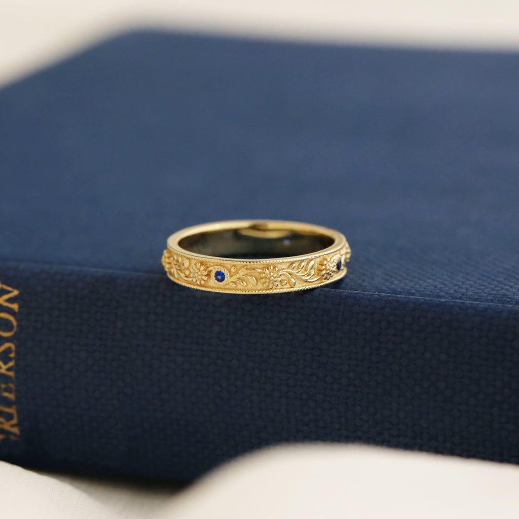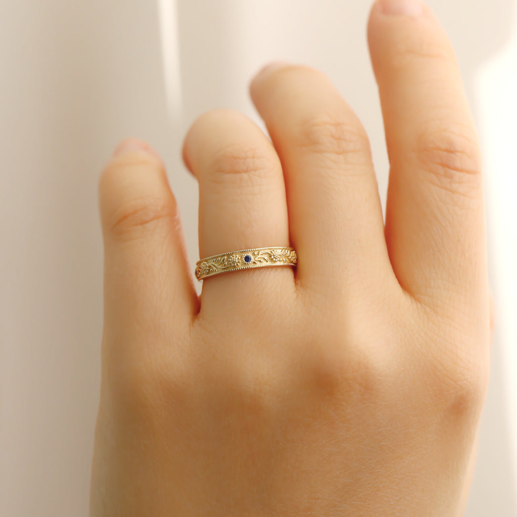 This enchanting eternity band captures the timeless beauty of September’s birthstone, Sapphire, and birth flower, the Aster. Intricately adorned with delicate floral engravings and deep sapphire accents, it is further elevated by refined French milgrain detailing, exuding an air of vintage romance.
