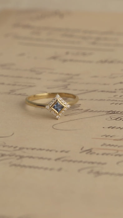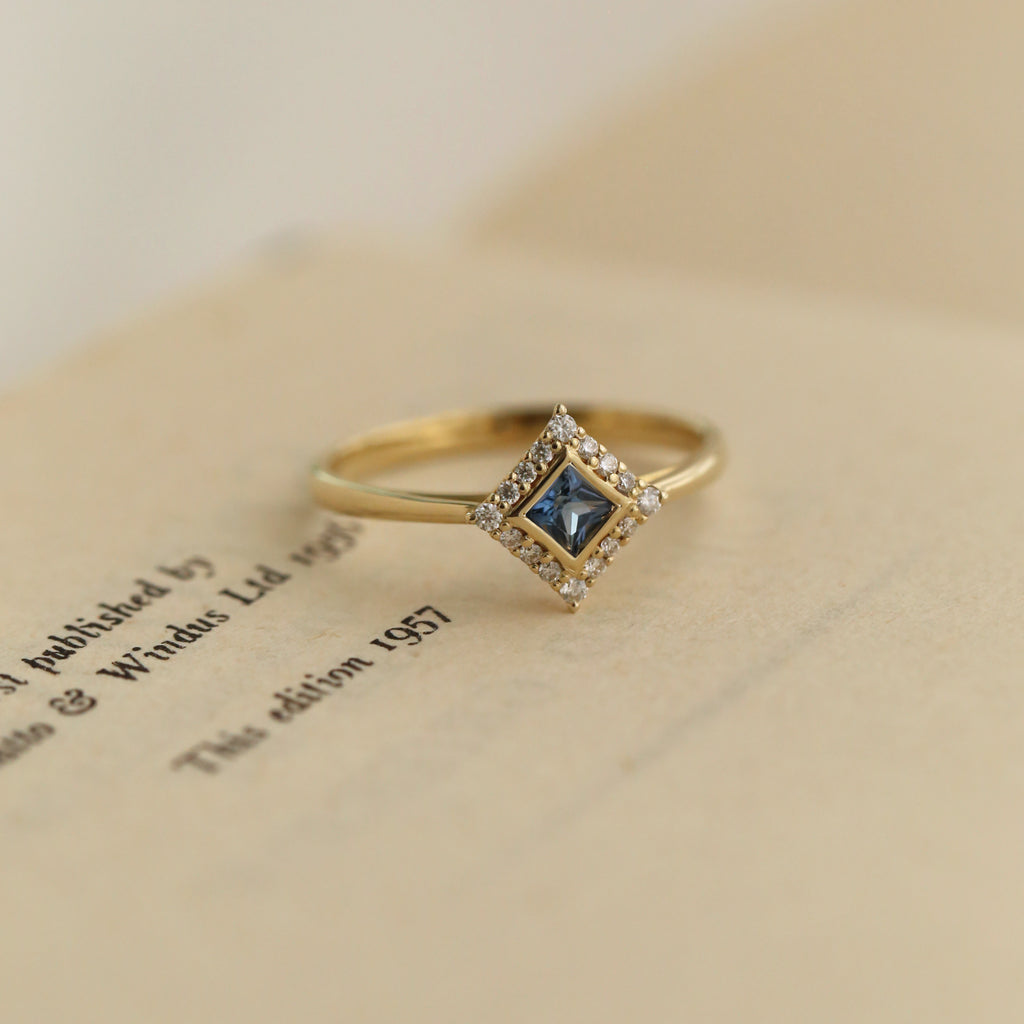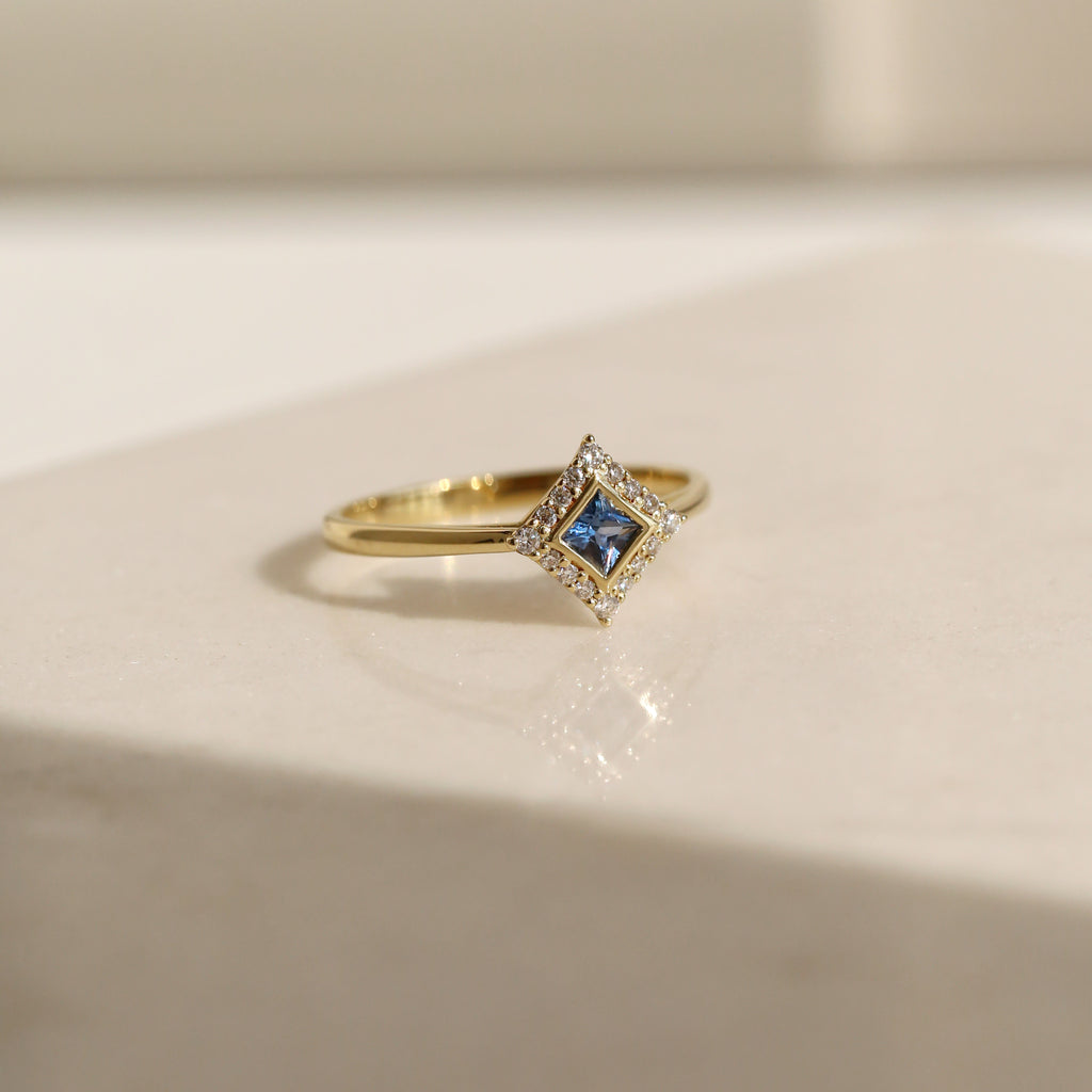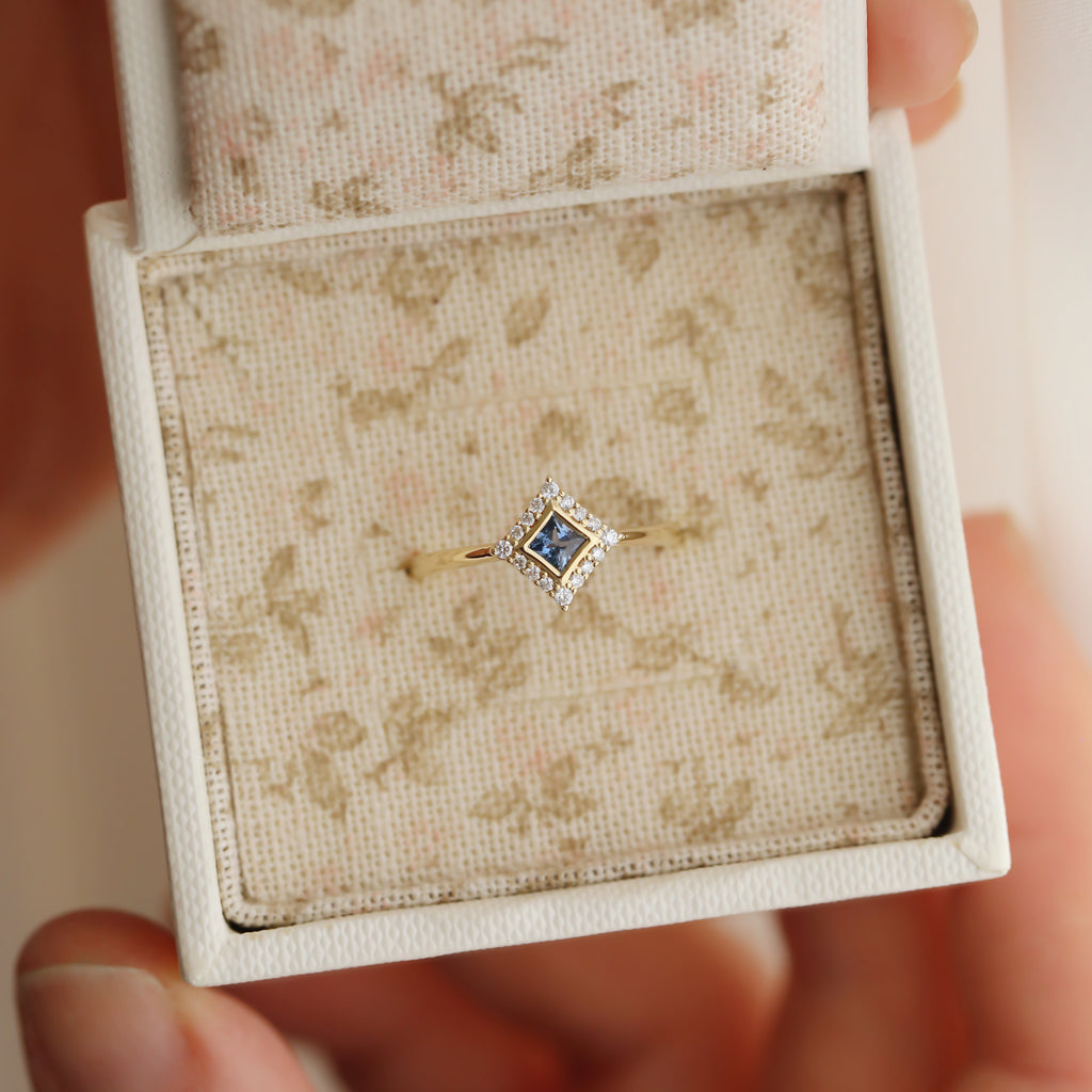 A serene sapphire lies at the center, encircled by a delicate diamond halo that shimmers like starlight.