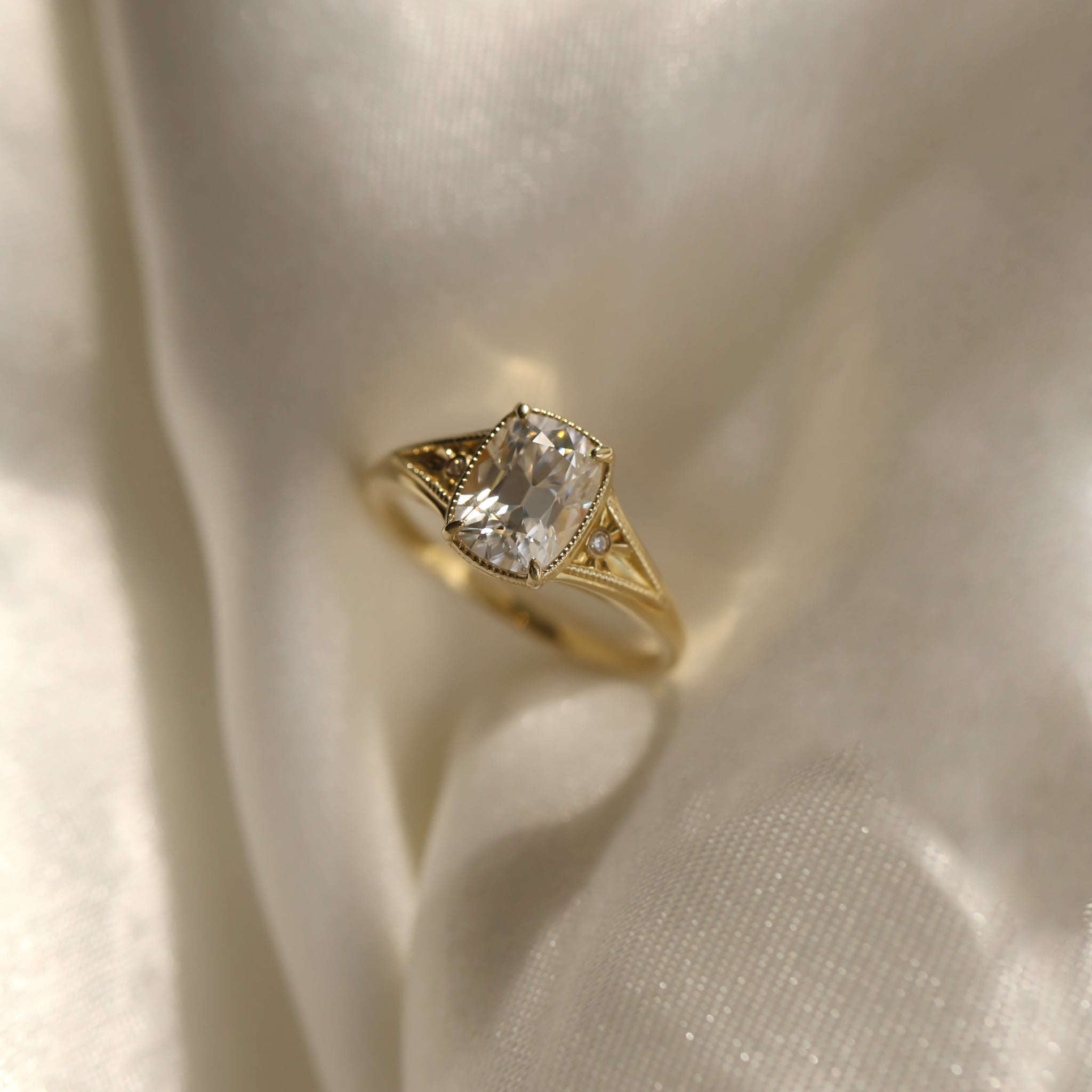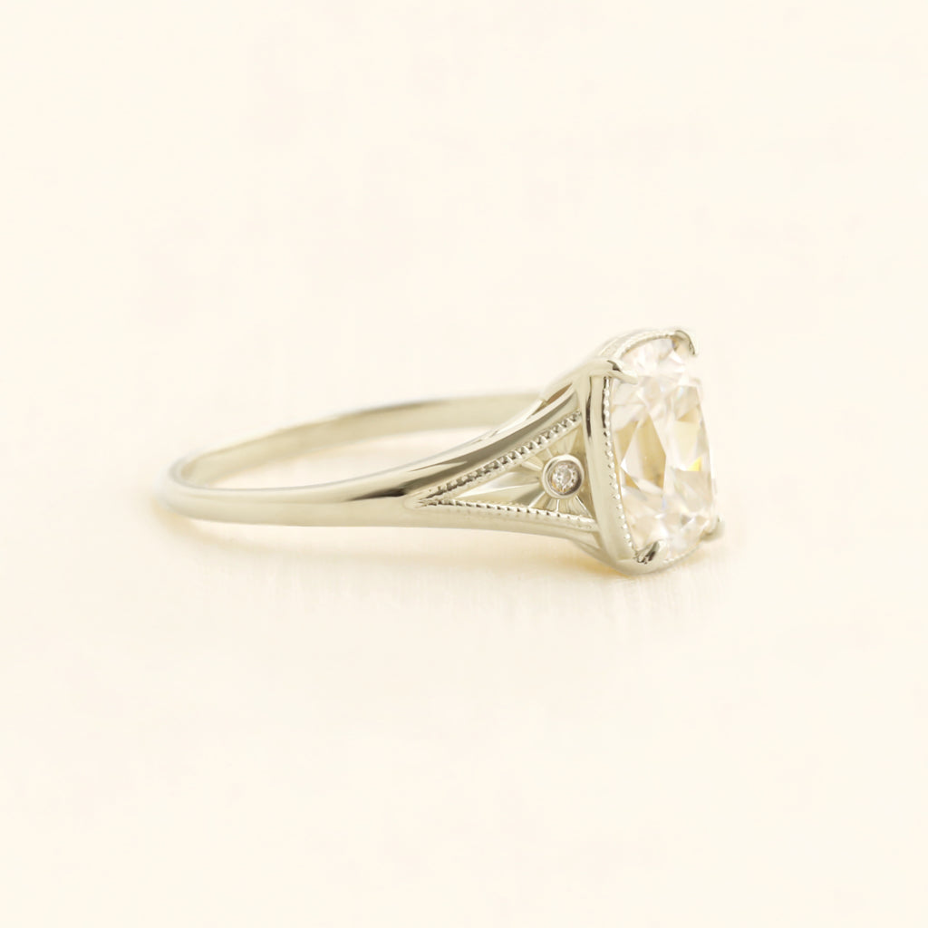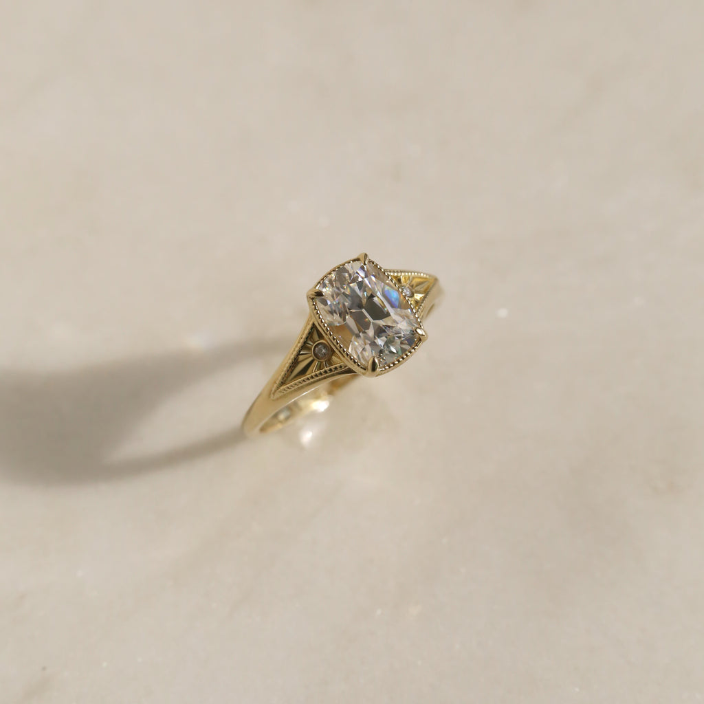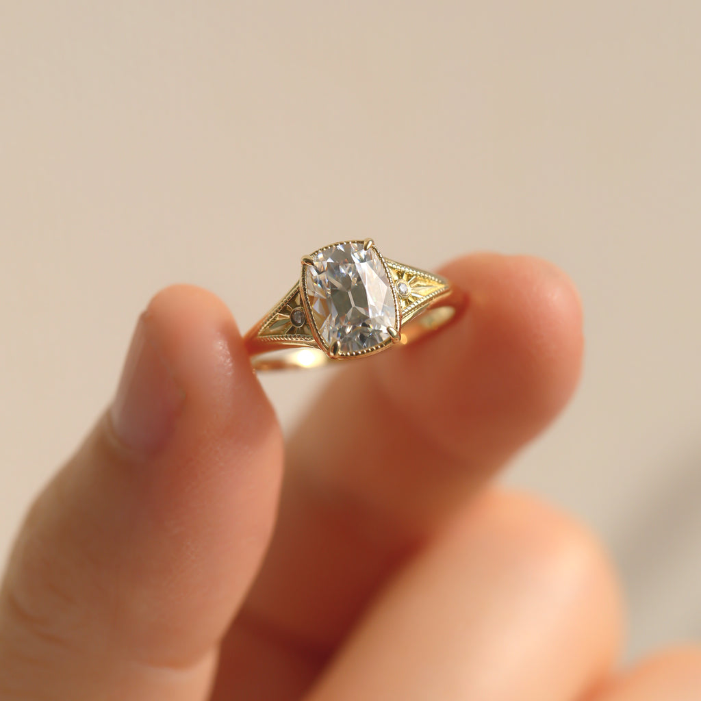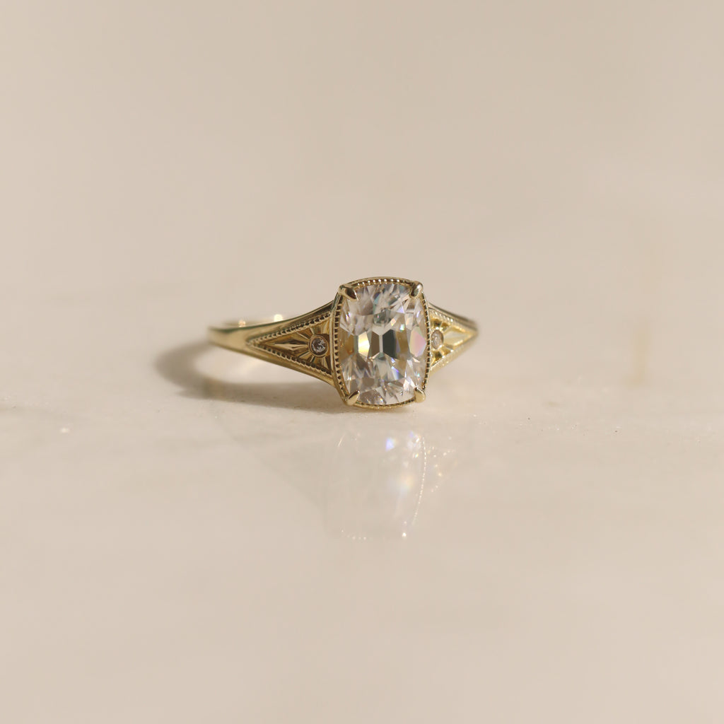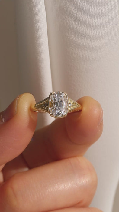 The central antique cushion-cut stone is a captivating focal point, its vintage facets maximizing a radiant, internal brilliance.
