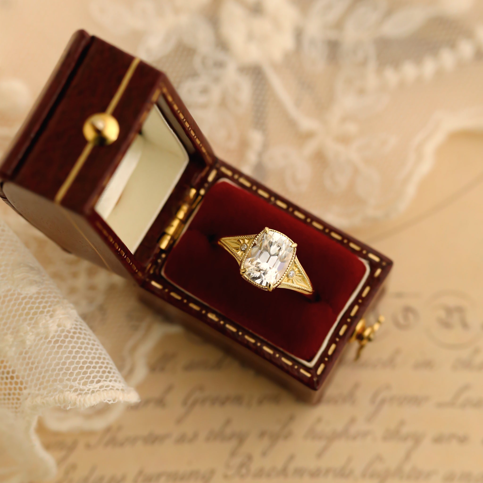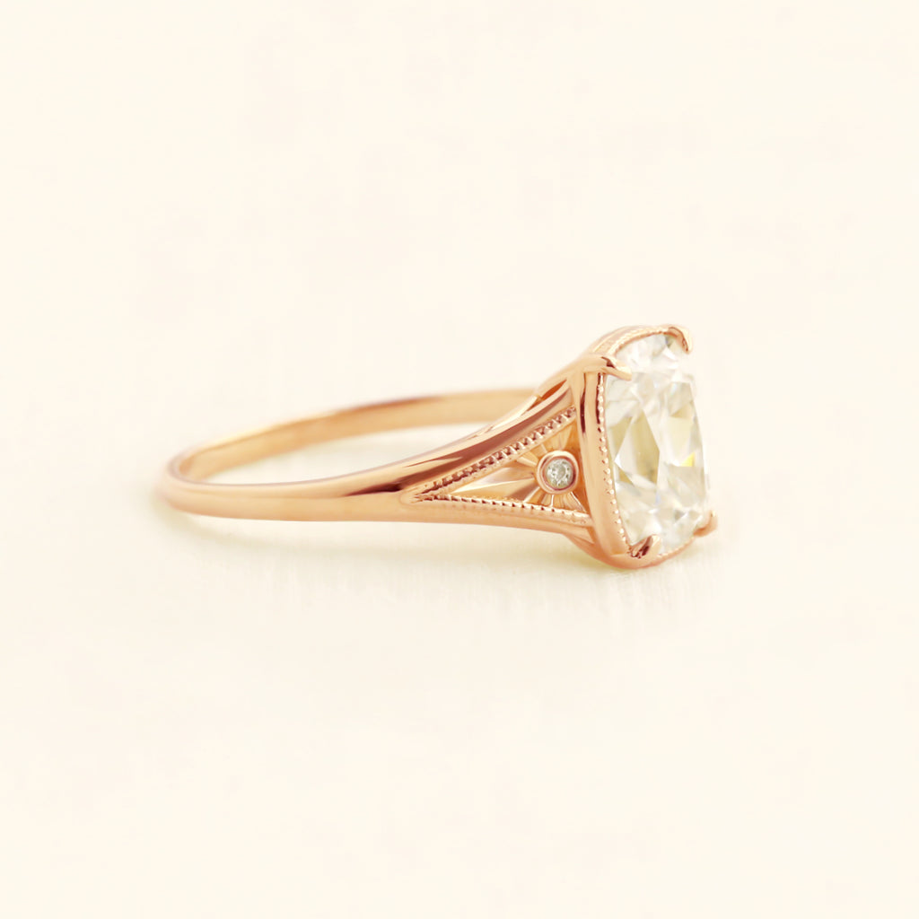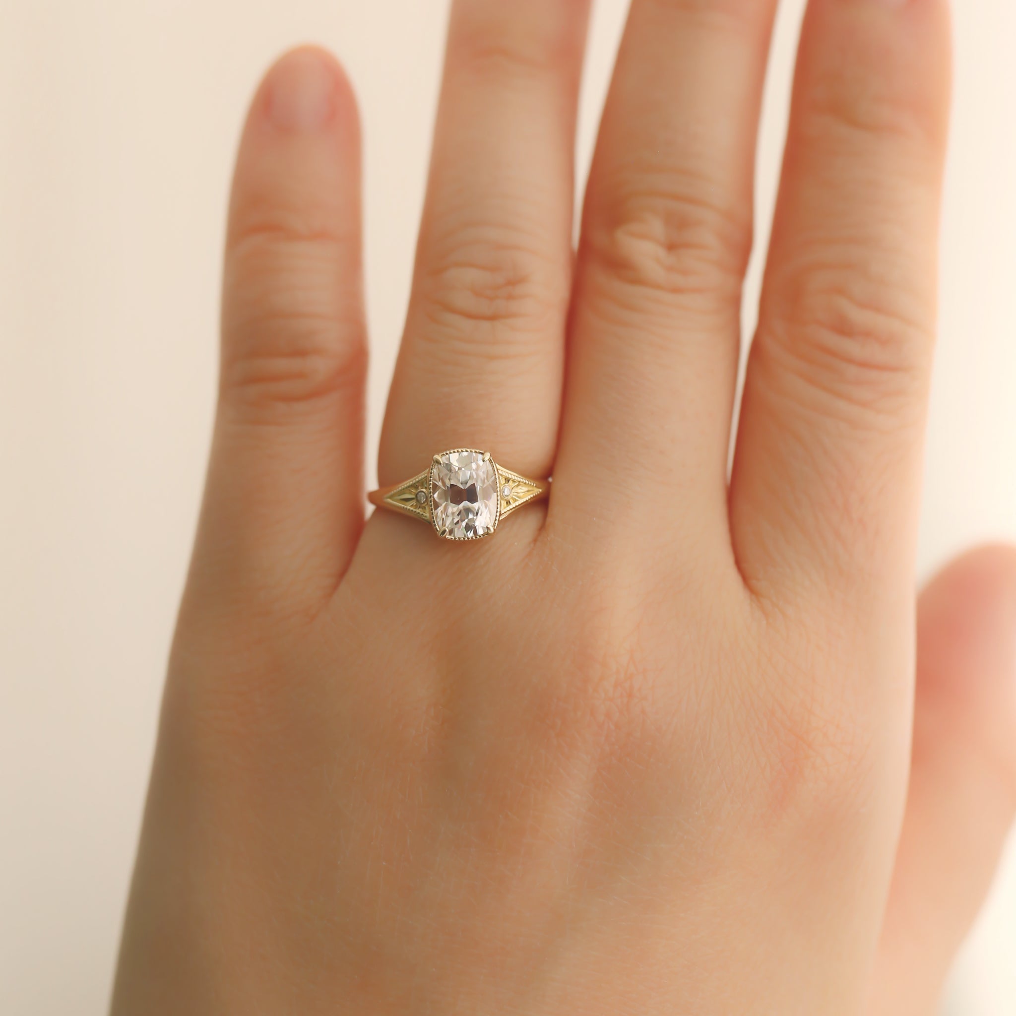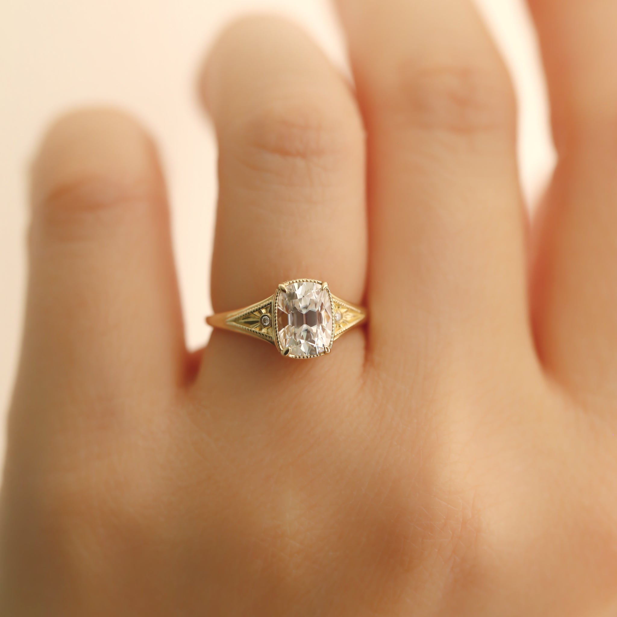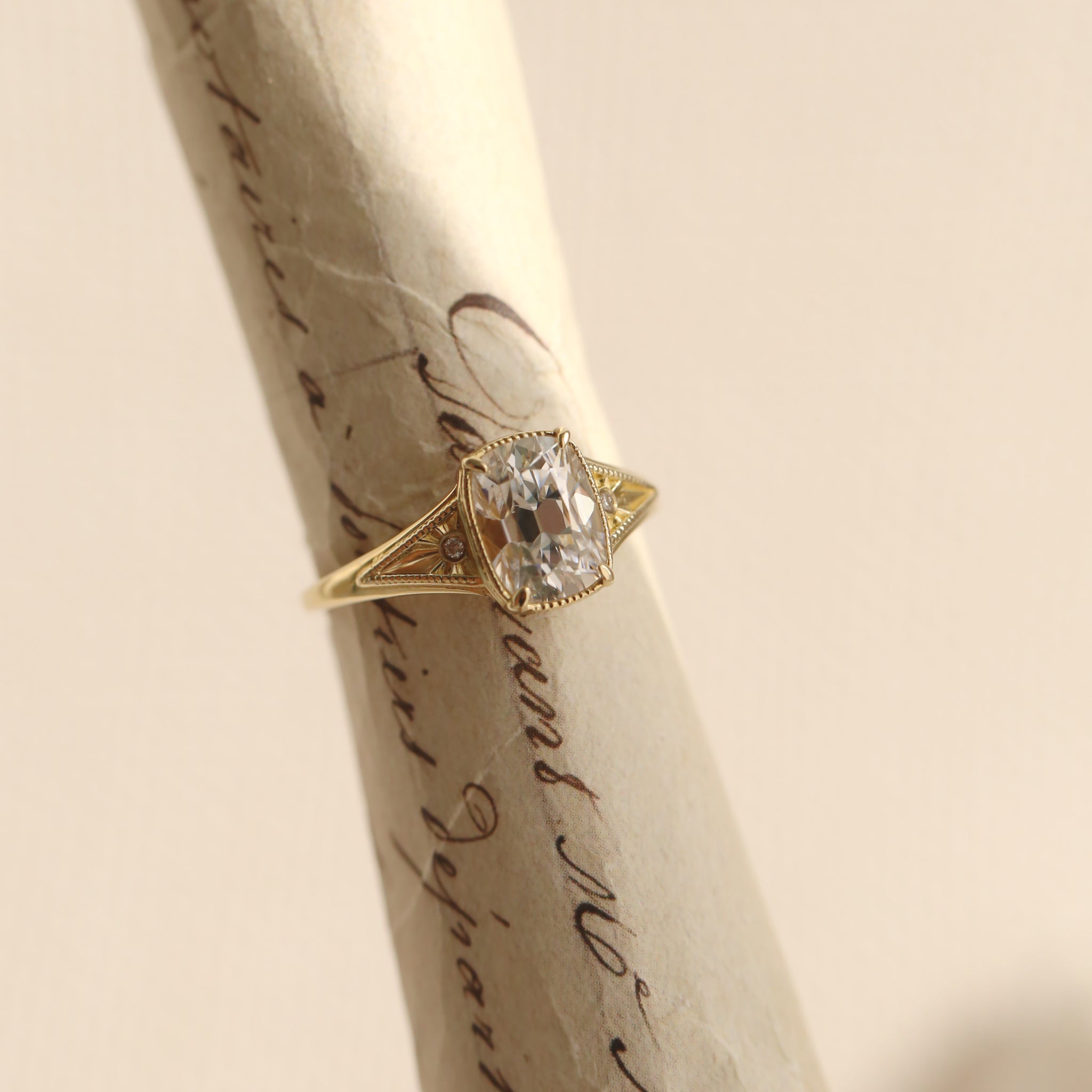 The central antique cushion-cut stone is a captivating focal point, its vintage facets maximizing a radiant, internal brilliance.